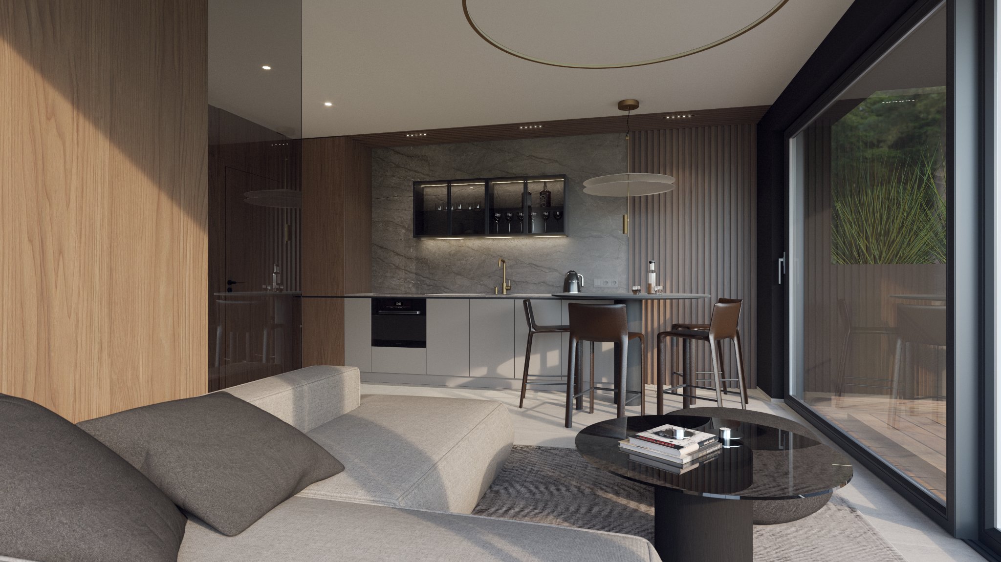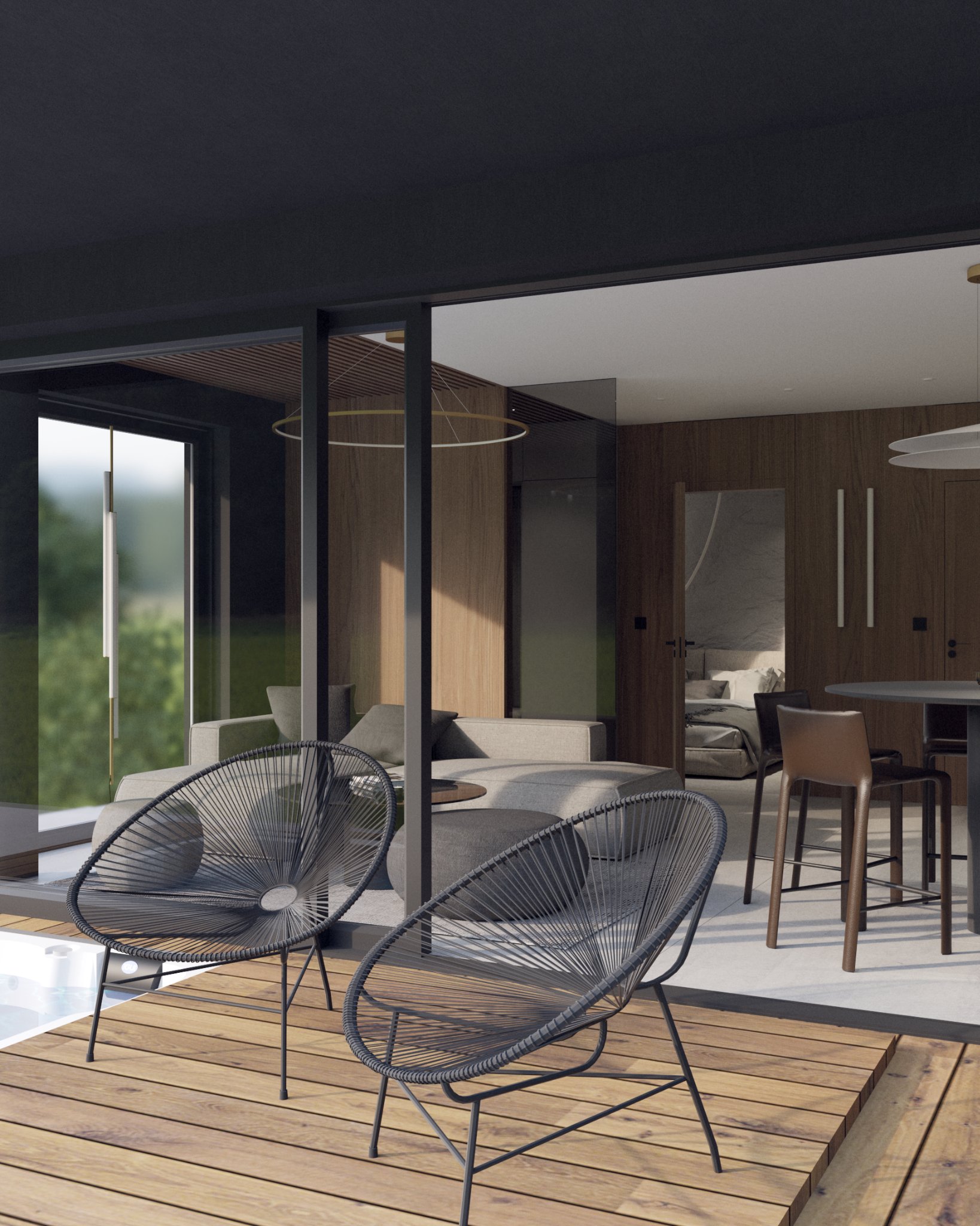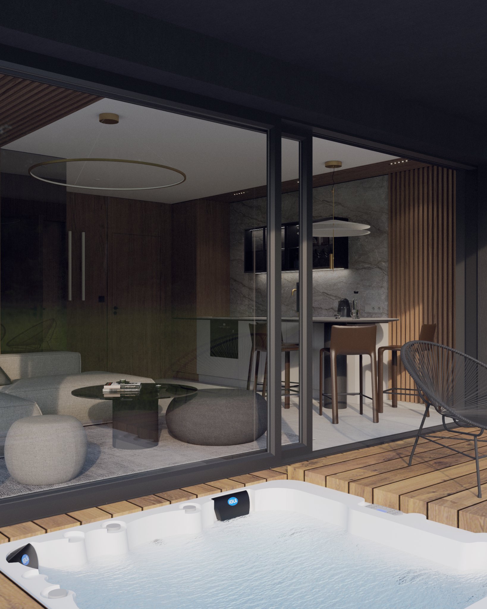 Jedná se o spodní apartmán s přímým vstupem na prostornou terasu, která nabízí nejen výhled do okolní přírody, ale i vlastní soukromou vířivku. Tato exkluzivní výhoda zajišťuje maximální komfort a relaxaci po celý rok – ať už si užíváte klidné večery pod širým nebem, nebo regeneraci po horské túře. Vířivka je umístěna přímo na terase apartmánu a je určena výhradně pro vás a vaše hosty. Tento benefit výrazně zvyšuje atraktivitu apartmánu jak pro osobní pobyt, tak pro krátkodobý pronájem.